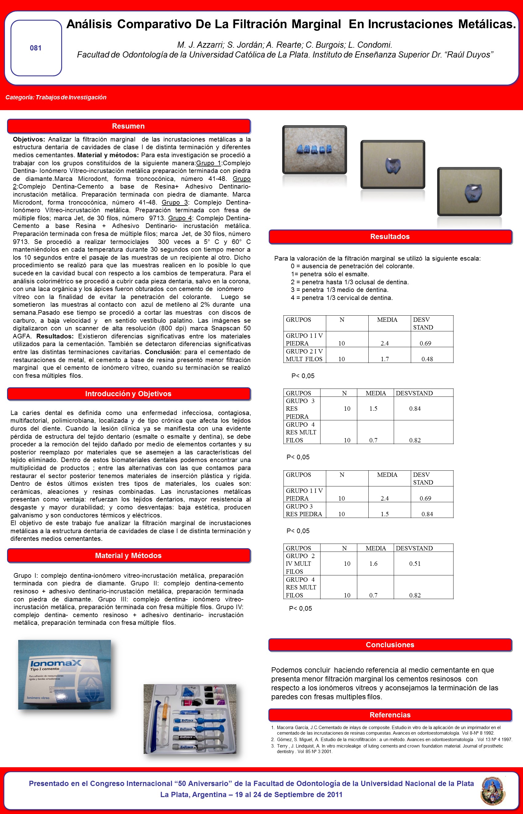 Fil: Burgois, Carlos. Universidad Católica de La Plata. Facultad de Odontología UCALP Convenio SOLP. Cátedra de Materiales Dentales. La Plata, Argentina